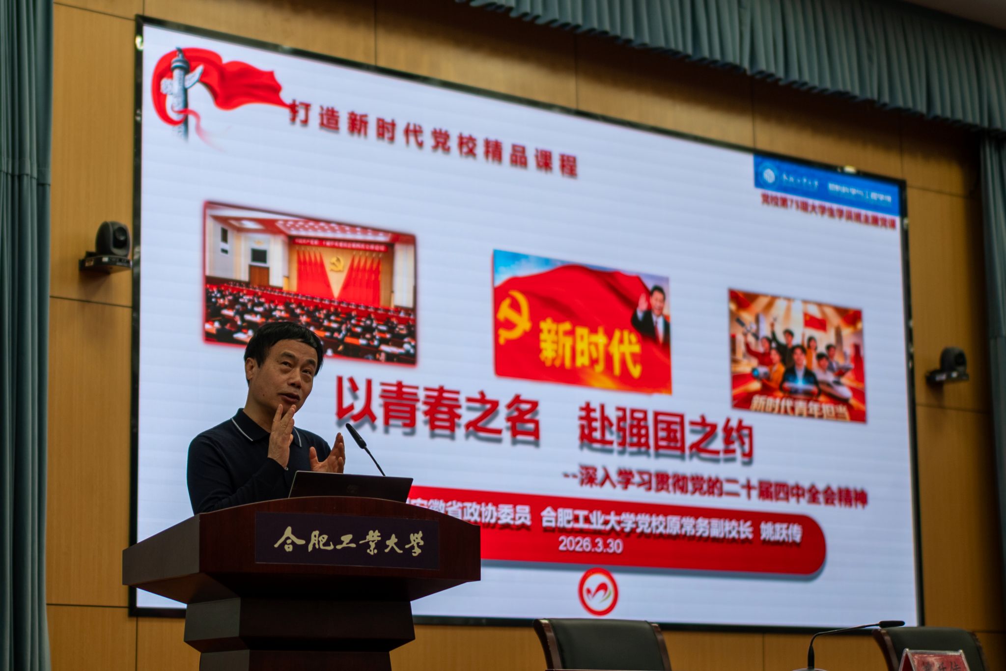 开班仪式结束后,十一、十二届安徽省政协委员、合肥工业大学党校原常务副校长姚跃传作题为《以青春之名 赴强国之约--深入学习贯彻党的二十届四中全会精神》的报告。他围绕学习贯彻习近平总书记在党的二十届四中全会上的重要讲话精神和全会审议通过的《中共中央关于制定国民经济和社会发展第十五个五年规划的建议》,从深刻认识全会主题、重大成果和重要意义,准确把握“十五五”时期在基本实现社会主义现代化进程中的重要地位,深刻领会和全面理解“十五五”时期经济社会发展的指导方针、主要目标、战略任务和重大举措、坚持和加强党的全面领导、凝聚起推进中国式现代化的磅礴力量等方面,对党的二十届四中全会作了全面阐释。勉励学员们要以习近平新时代中国特色社会主义凝心铸魂,深刻领悟党的二十届四中全会精神,把“两个确立”体现为做到“两个维护”的政治自觉、思想自觉、行动自觉,真正转化为对习近平新时代中国特色社会主义思想的忠诚信仰、对中国特色社会主义的坚定信念、对中国式现代化的坚强信心,为“十五五”规划提出的奋斗目标,在推进强国建设、民族复兴伟业中奋力书写中国式现代化挺膺担当的青春篇章。
