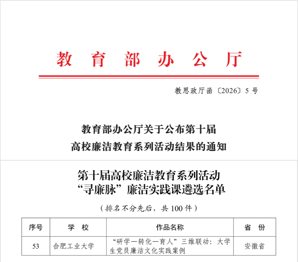 近日,教育部公布第十届高校廉洁教育系列活动结果,我院作品《“研学—转化—育人”三维联动:大学生党员廉洁文化实践案例》成功入选“寻廉脉”廉洁实践课遴选名单。