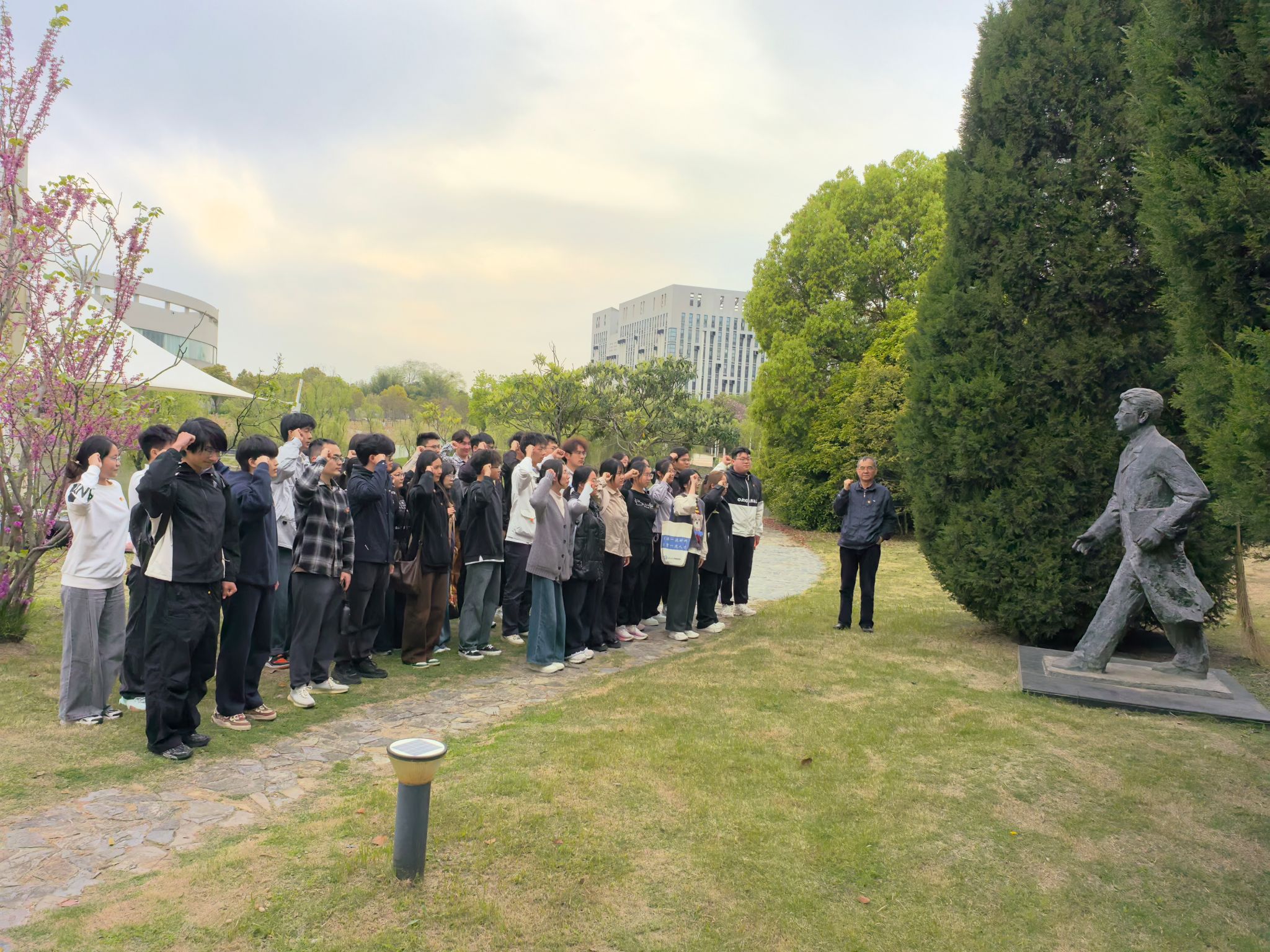 在烈士塑像前,材料学院本科生第二党支部全体毕业年级党员和入党积极分子庄重宣誓。以铿锵誓言展现新时代大学生党员继承先烈遗志、矢志科技报国的坚定决心。